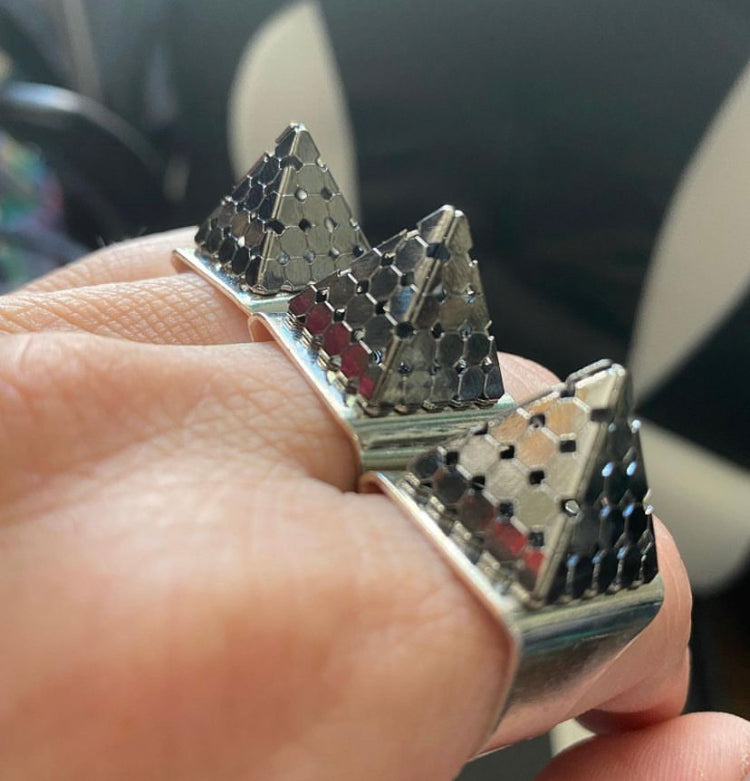 These are hand made stainless steel pyramid rings. In the photo the model is wearing 3 rings. Adjustable ring